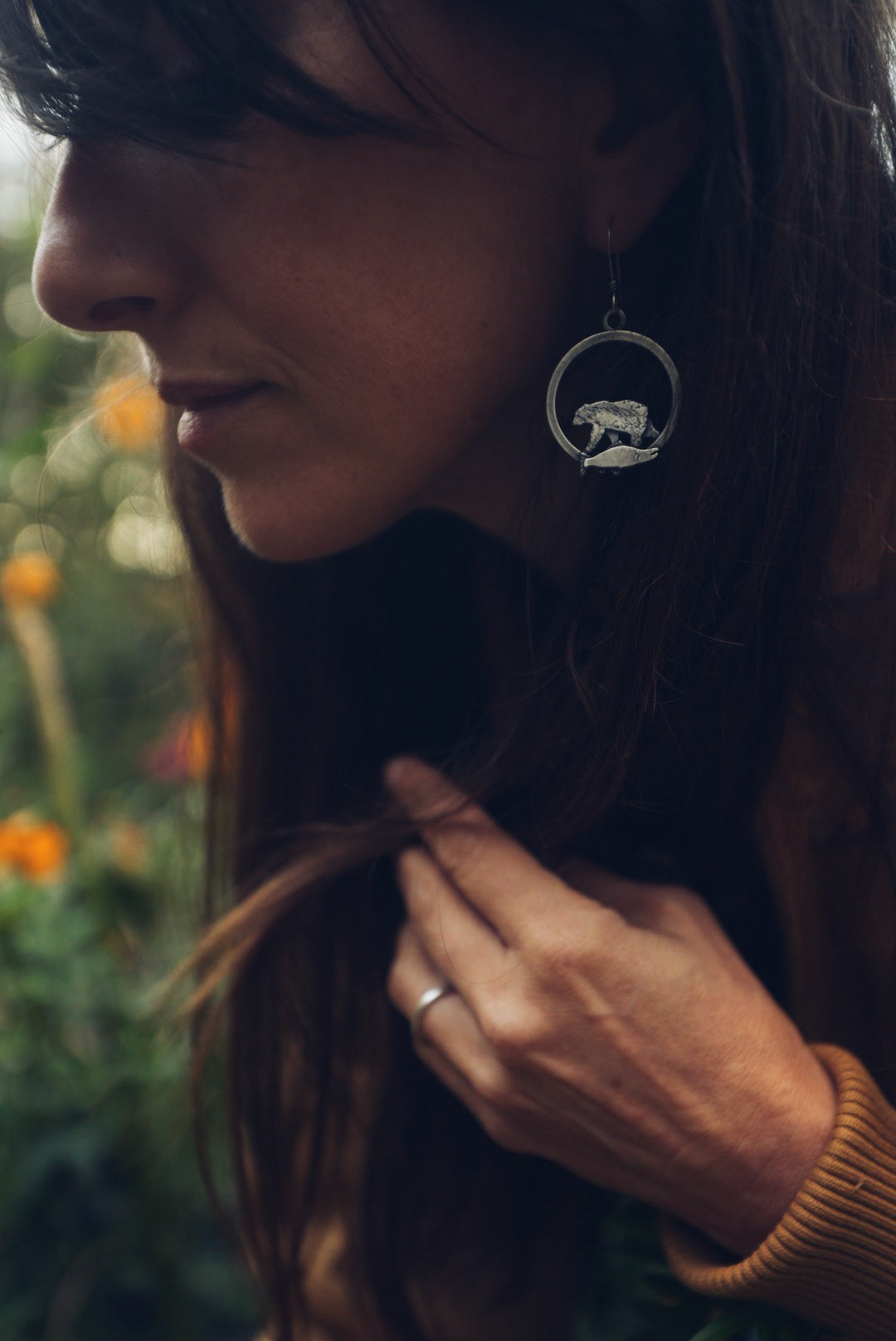 Experience the gentle strength of Bear Hoops, inspired by the harmony of bears and spawning salmon. These lightweight hoops are comfortable and loveable, making them perfect for everyday wear. Embrace a connection to the wild while enjoying a subtle, compassionate reminder of nature’s resilience and balance.