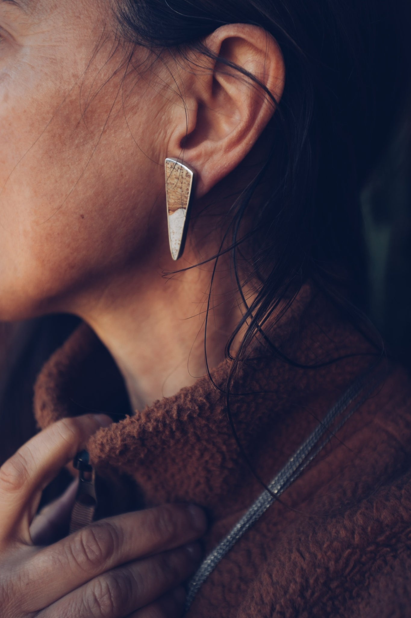 This pair of bookmatched desert jasper stones are some of the prettiest I’ve worked with. The sterling silver is rolled out thin so that these aren’t heavy. They come with a flat silicone backing for a comfortable, secure fit.