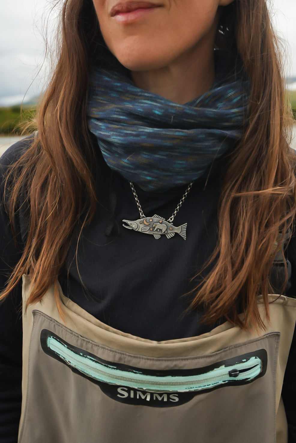 The Katmai Necklace is my favorite creation so far, honoring the spirit of Katmai National Park and Reserve. Inspired by bears and spawning sockeye salmon, it captures a sense of magic and good vibes. Its kinetic jaw adds a fun and lively touch and I made sure the design would not snag on clothes. This piece has traveled far and wide and I’ve never been more proud of my wares. Really excited to see who gets this one.