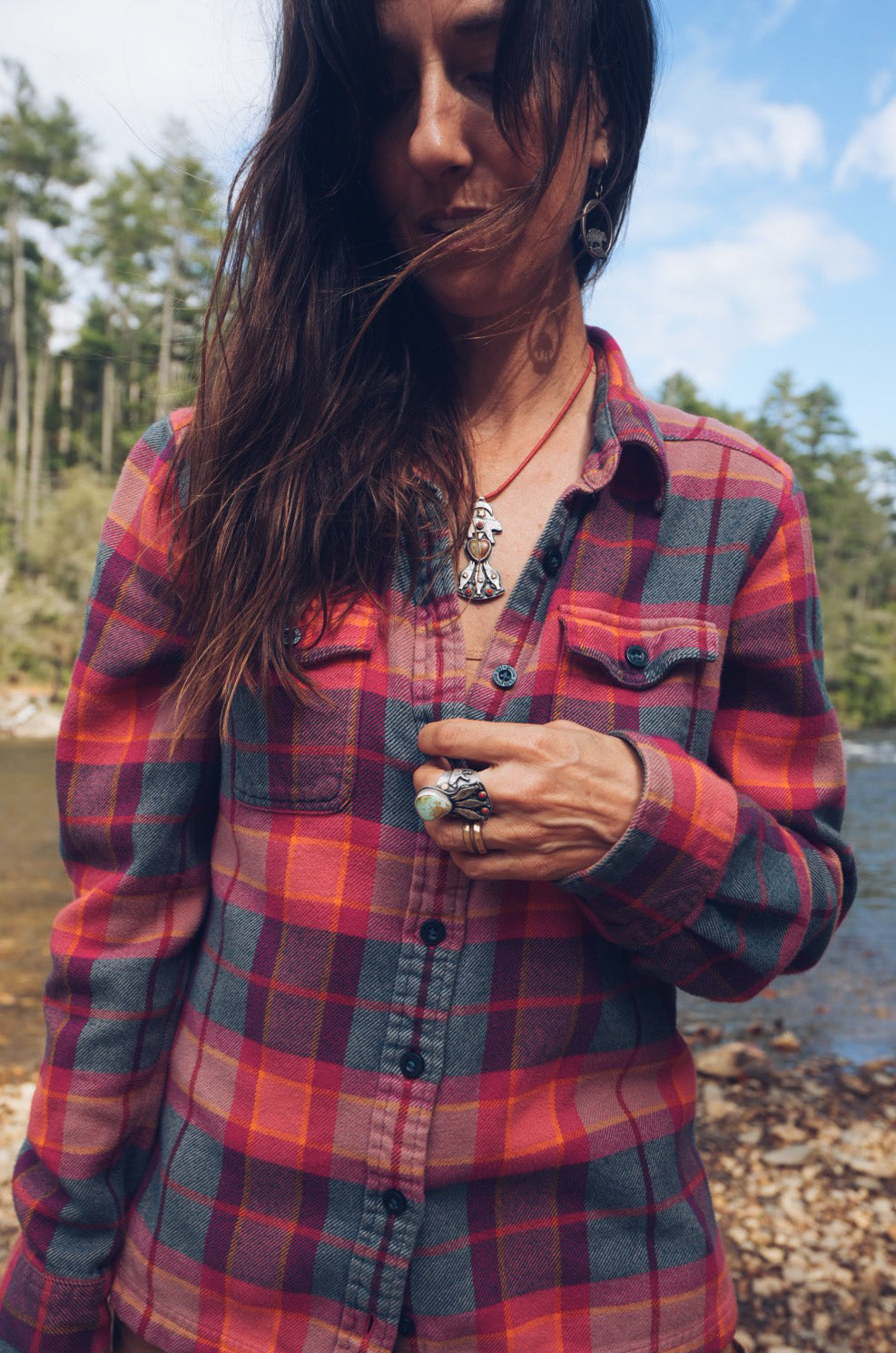 The Salmon Run Necklace features a strand of bamboo coral beads in fiery red, echoing the colors of a river in motion. Accented with gold stars, this piece captures the tragic beauty of the sockeye salmon’s fertile journey. Elegantly designed, it hangs so gracefully to enhance any ensemble with a sophisticated nod to nature’s resilience.