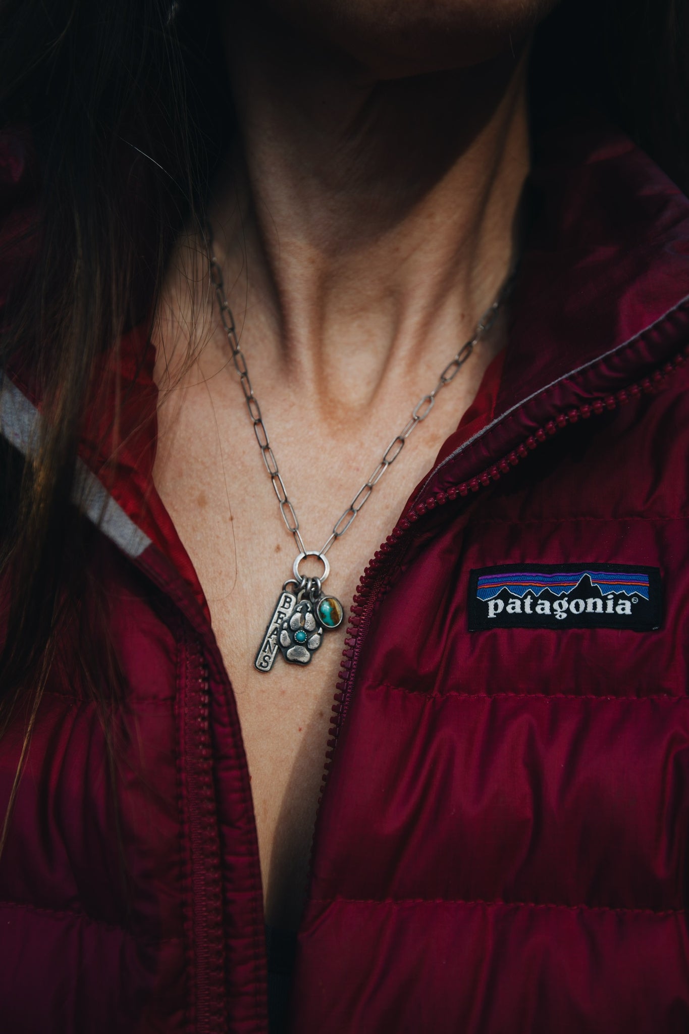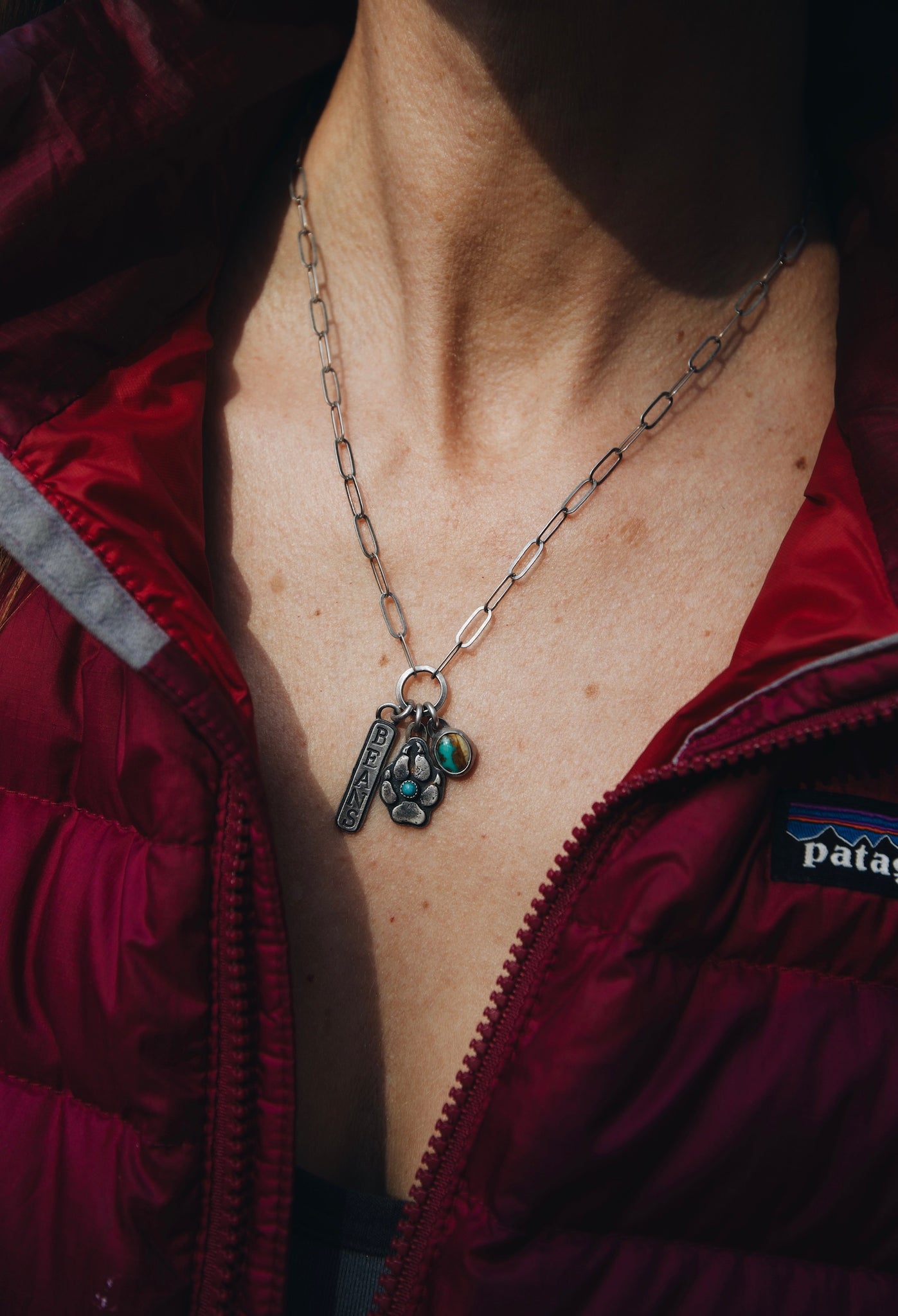 Ode to Dog has been so loved that there are different versions of this necklace. This version has the nameplate and one stone that hangs in the middle of the paw and the nameplate. You choose one stone out of the 13 below.