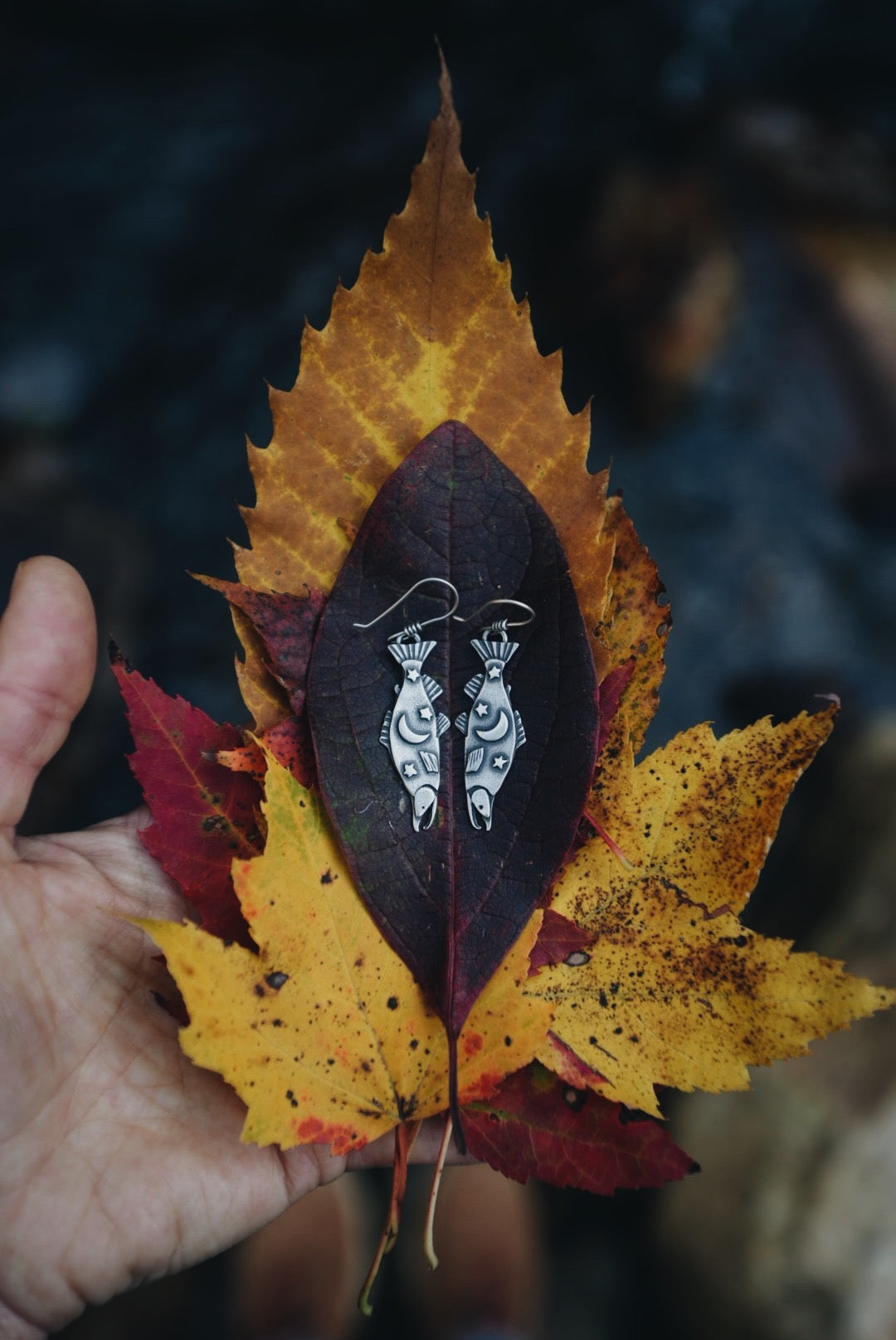 Inspired by the majestic sockeye salmon run of Katmai and adorned with delicate crescent moon and star details, these lightweight salmon earrings bring about a sense of wonder and connection to nature. I had these pictured in my mind as I photographed salmon 5k miles from my studio. These are made for those who cherish the magic of the wild. They blend grace with a heartfelt tribute to the natural world. I really love these and made a pair for myself.