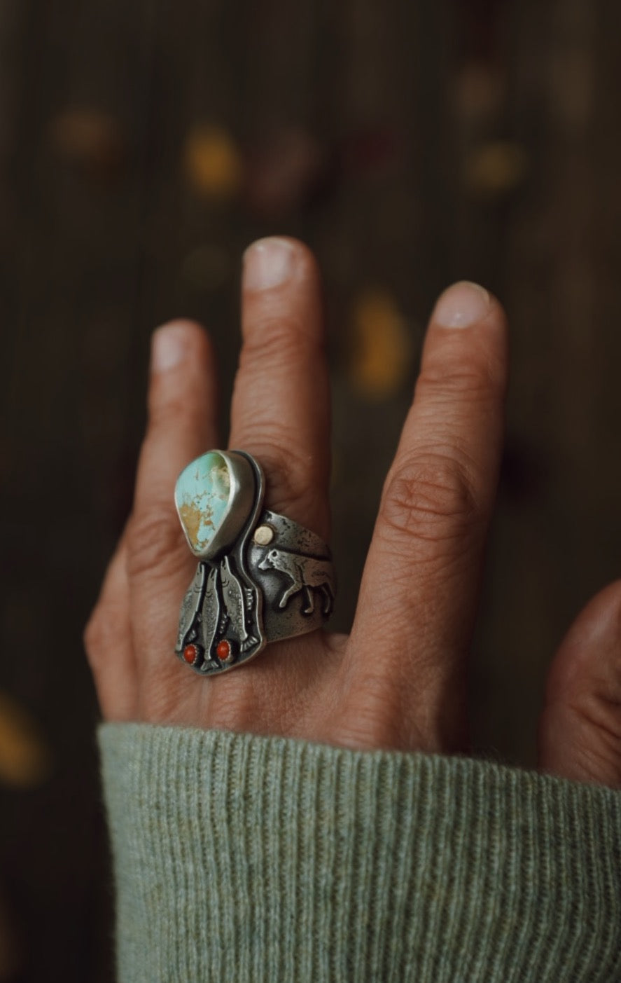 Celebrate the wild cycle of life with the Live and Let Die Ring. Inspired by the brown bear, coastal wolf, and the mighty sockeye salmon’s epic run, this ring captures the tragic beauty of death and rebirth. The rich red tone of the coral symbolizes salmon eggs, a powerful promise of new life amid the rugged river and tundra wilderness. Wear a playful reminder that every ending sparks a fresh beginning. I love this one so much.